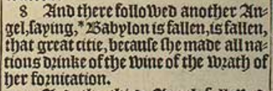 8 And there followed another Angel, saying, *Babylon is fallen, is fallen, that great citie, because she made all nations drinke of the wine of the wrath of her fornication.[*Esa.21.9. iere.51.8. chap.18.2.]