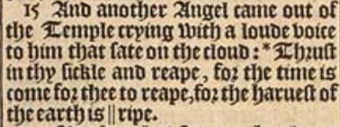 15 And another Angel came out of the Temple crying with a loude voice to him that sate on the cloud: *Thrust in thy sickle and reape, for the time is come for thee to reape, for the haruest of the earth is ||ripe.[*Ioel 3.13. , Or, dryed.]