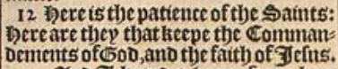 12 Here is the patience of the Saints: Here are they that keepe the Commandements of God, and the faith of Iesus.