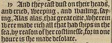 19 And they cast dust on their heads, and cried, weeping, and wailing, saying, Alas, alas, that great citie, wherein were made rich all that had ships in the sea, by reason of her costlinesse, for in one houre is she made desolate.
