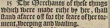 15 The Merchants of these things which were made riche by her, shall stand afarre off for the feare of her torment, weeping and wailing.