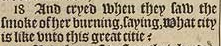 18 And cryed when they saw the smoke of her burning, saying, What city is like vnto this great citie?