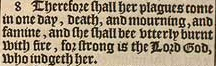 8 Therefore shall her plagues come in one day, death, and mourning, and famine, and she shall bee vtterly burnt with fire, for strong is the Lord God, who iudgeth her.