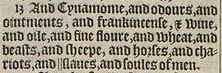 13 And Cynamome, and odours, and ointments, and frankincense, & wine, and oile, and fine floure, and wheat, and beasts, and sheepe, and horses, and chariots, and ||slaues, and soules of men. [|| Or, bodies. ]
