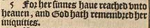 5 For her sinnes haue reached vnto heauen, and God hath remembred her iniquities.