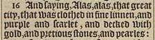 16 And saying, Alas, alas, that great city, that was clothed in fine linnen, and purple and scarlet, and decked with gold, and pretious stones, and pearles: