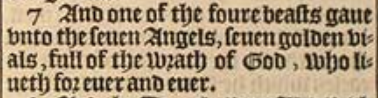 7 And one of the foure beasts gaue vnto the seuen Angels, seuen golden vials, full of the wrath of God, who liueth for euer and euer.