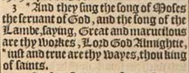 3 *And they sing the song of Moses the seruant of God, and the song of the Lambe, saying, Great and marueilous are thy workes, Lord God Almightie, *iust and true are thy wayes, thou king of saints.[*Exo.15.1. *Psal.145.17.]