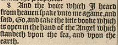 8 And the voice which I heard from heauen spake vnto me againe, and said, Go, and take the litle booke which is open in the hand of the Angel which standeth vpon the sea, and vpon the earth.