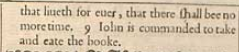 9 And I went vnto the Angel, and said vnto him, Giue me the little booke. And he sayd vnto me, *Take it, and eat it vp, and it shall make thy belly bitter, but it shall bee in thy mouth sweete as hony.[*Ezek.2.8. and 3.3.]