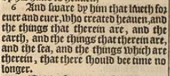 6 And sware by him that liueth for euer and euer, who created heauen, and the things that therein are, and the earth, and the things that therein are, and the sea, and the things which are therein, that there should bee time no longer.
