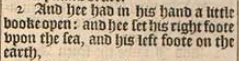 2 And hee had in his hand a little booke open: and hee set his right foote vpon the sea, and his left foote on the earth,