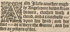 1 And I saw another mighty Angel come down from heauen, clothed with a cloud, and a rainebow was vpon his head, and his face was as it were the Sunne, and his feet as pillars of fire.