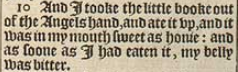 10 And I tooke the little booke out of the Angels hand, and ate it vp, and it was in my mouth sweet as honie: and as soone as I had eaten it, my belly was bitter.