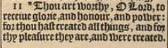 11* Thou art worthy, O Lord, to receiue glorie, and honour, and power: for thou hast created all things, and for thy pleasure they are, and were created.[*Chap.5. 12.]