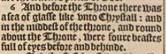 6 And before the Throne there was a sea of glasse like vnto Chrystall: and in the middest of the throne, and round about the Throne, were foure beastes full of eyes before and behinde.