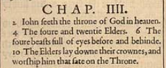4 And round about the Throne were foure and twentie seates, and vpon the seates I saw foure and twentie Elders sitting, clothed in white rayment, and they had on their heades crownes of golde.
