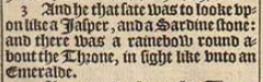 3 And he that sate was to looke vpon like a Iasper, and a Sardine stone: and there was a rainebow round about the Throne, in sight like vnto an Emeralde.