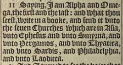 11 Saying, I am Alpha and Omega, the first and the last: and what thou seest, write in a booke, and send it vnto the seuen Churches which are in Asia, vnto Ephesus, and vnto Smyrna, and vnto Pergamos, and vnto Thyatira, and vnto Sardis, and Philadelphia, and vnto Laodicea.