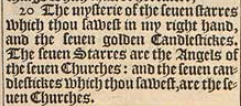 20 The mysterie of the seuen starres which thou sawest in my right hand, and the seuen golden Candlestickes. The seuen Starres are the Angels of the seuen Churches: and the seuen candlestickes which thou sawest, are the seuen Churches.