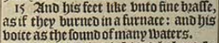 15 And his feet like vnto fine brasse, as if they burned in a furnace: and his voice as the sound of many waters.