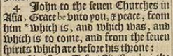 4 Iohn to the seuen Churches in Asia, Grace be vnto you, & peace, from him *which is, and which was, and which is to come, and from the seuen spirits which are before his throne:[*Exo.3.14.]