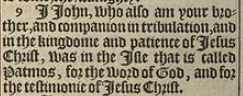 9 I Iohn, who also am your brother, and companion in tribulation, and in the kingdome and patience of Iesus Christ, was in the Isle that is called Patmos, for the word of God, and for the testimonie of Iesus Christ.