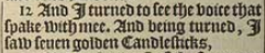 12 And I turned to see the voice that spake with mee. And being turned, I saw seuen golden Candlesticks,