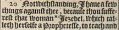 20 Notwithstanding, I haue a few things against thee, because thou sufferest that woman *Iezebel, which calleth herselfe a Prophetesse, to teach and to seduce my seruants to commit fornication, and to eat things sacrificed vnto idoles. [*1. Kin.16. 31.]
