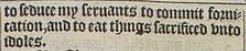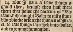 14 But I haue a fewe things against thee, because thou hast there them that holde the doctrine of *Balaam, who taught Balac to cast a stumbling blocke before the children of Israel, to eate things sacrificed vnto idoles, and to commit fornication.[*14 Num.25.]