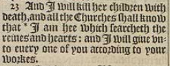 23 And I will kill her children with death, and all the Churches shall know that *I am hee which searcheth the reines and hearts: and I will giue vnto euery one of you according to your workes.[*Iere. 11. 20.and 17. 10.]