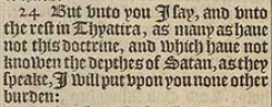 24 But vnto you I say, and vnto the rest in Thyatira, as many as haue not this doctrine, and which haue not knowen the depthes of Satan, as they speake, I will put vpon you none other burden: