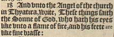 18 And vnto the Angel of the church in Thyatira, write, These things saith the Sonne of God, who hath his eyes like vnto a flame of fire, and his feete are like fine brasse: