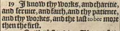 19 I know thy works, and charitie, and seruice, and faith, and thy patience, and thy workes, and the last to bee more then the first.