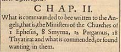 Was den Engeln aufzuschreiben geboten ist, welche die Gesandten der Kirchen von 1 Ephesus, 8 Smyrna, 12 Pergamus, 18 Thyatira sind: Und was empfohlen wird oder in ihnen mangelhaft gefunden wird.