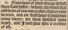 10 Feare none of those things which thou shalt suffer: behold, the deuill shal cast some of you into prison, that ye may be tried, and yee shall haue tribulation tenne dayes: bee thou faithfull vnto death, and I will giue thee a crowne of life.