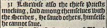 31 Likewise also the chiefe Priests mocking, said among themselues with the Scribes, He saued others, himselfe he cannot saue.
