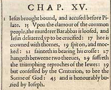 1 Jesus gebunden vor Pilatus gebracht und beschuldigt. 15 Auf das Geschrei der gewöhnlichen Leute wird der Mörder Barabbas befreit und Jesus wird herausgeführt, um gekreuzigt zu werden: 17 Er wird mit Dornen gekrönt, 19 bespuckt und verhöhnt: 21 Wird schwach beim Tragen seines Kreuzes: 27 Hängt zwischen zwei Dieben, 29 erleidet die triumphierenden Vorhaltungen der Juden: 39 Aber bekennt beim Zenturio, der Sohn Gottes zu sein: 43 Und wird ehrenvoll von Joseph begraben.