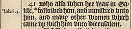 41 Who also when hee was in Galile, *followed him, and ministred vnto him, and many other women which came vp with him vnto Hierusalem.[*Luke 8. 3.]