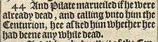 44 And Pilate marueiled if he were already dead, and calling vnto him the Centurion, hee asked him whether hee had beene any while dead.