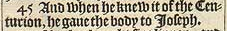 45 And when he knew it of the Centurion, he gaue the body to Ioseph.