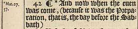 42 ¶ *And now when the euen was come, (because it was the Preparation, that is, the day before the Sabbath)[*Mat.27. 57.
