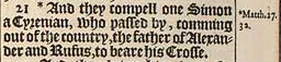 21 *And they compell one Simon a Cyrenian, who passed by, comming out of the country, the father of Alexander and Rufus, to beare his Crosse. [ *Matth.27. 32. ]