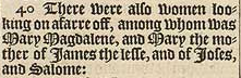 40 There were also women looking on afarre off, among whom was Mary Magdalene, and Mary the mother of Iames the lesse, and of Ioses, and Salome:
