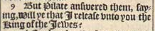 9 But Pilate answered them, saying, Will ye that I release vnto you the King of the Iewes?