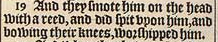 19 And they smote him on the head with a reed, and did spit vpon him, and bowing their knees, worshipped him.