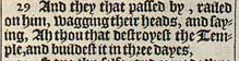 29 And they that passed by, railed on him, wagging their heads, and saying, Ah thou that destroyest the Temple, and buildest it in three dayes,