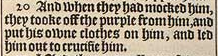 20 And when they had mocked him, they tooke off the purple from him, and put his owne clothes on him, and led him out to crucifie him.