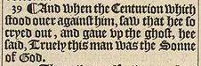 39 ¶ Und als der Zenturio, der ihm gegenüber stand, sah, dass er so schrie und den Geist aufgab, sagte er "Wahrlich, dieser Mann war der Sohn Gottes."