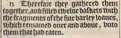 13 Therefore they gathered them together, and filled twelue baskets with the fragments of the fiue barley loaues, which remained ouer and aboue, vnto them that had eaten.